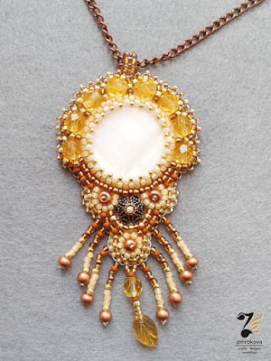 Słoneczny miodowo-brązowo-żółty naszyjnik z listkiem. W centrum biała masa perłowa.